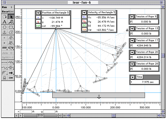 Working Model also helped Boitnott improve the safety standards of his tests. "Working Model made sure I didn't exceed the maximum acceptable cable loads while trying to acheive the right impact attitudes," added Boitnott. Boitnott was able to monitor the loads while each simulation ran by watching the meter he had chosen to measure the load fluctions.