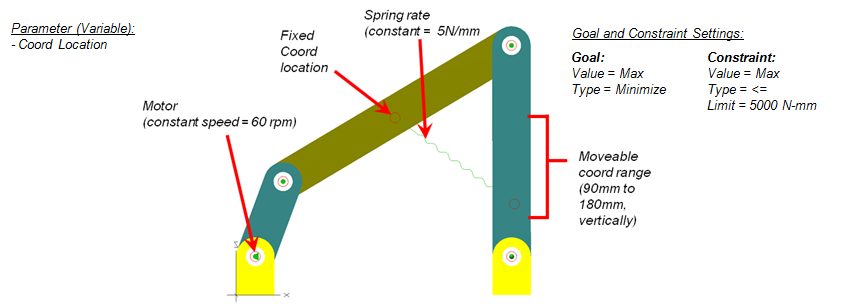 - Parameters - The values that will be changed to achieve an optimized objective. These can be any type of SimWise value, such as the stiffness of a spring, or the location of a joint.