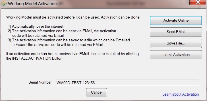 - Save File – Clicking this button will prompt for the name of a file into which the server information will be written. You can then send an Email to activation@design-simulation.com and attach the file to the Email message. DST will return the license code to you in an Email with the license file as an attachment. The Email will contain instructions on how to install the code, but briefly you need to save the Email file attachment, display the above Activation Window, and the click Install Activation. You will be prompted to select the file you just saved and the license code will be read from that file and installed. After successful installation, the product will start.