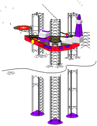 The platform of this drilling unit is a triangular hull 30 feet deep and 200 feet on each side. The platform supports a drill derrick for operations in a marine environment. The platform is supported by jack-ups, three legs that pass through the buoyant hull structure, via legwells, near the three corners of the hull. These legs are about 400 feet in length and can be lowered until they contact the sea floor and begin to raise the platform up until the hull bottom is higher than the crests of the waves.