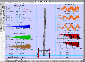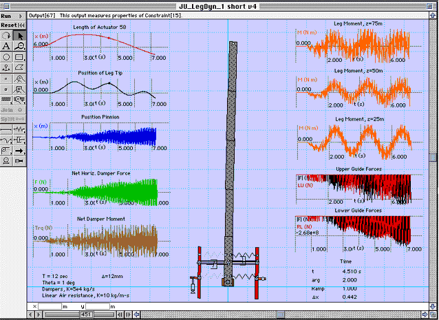 The Noble Denton engineer specified degrees and duration of amplitude, linear air resistance, and other parameters to apply to his simulations, again using the easy-to-follow selections from Working Model's Measure and Windows pulldown selections. Dr. Smith then chose the different graphic meters that he wanted to display beside his simulation iterations, displaying Net Horizontal Damper Force, Bending Moment, and other specific results generated from running the simulations. Dr. Smith was particularly interested in the torsional or bending moment of the legs. With each simulation, the engineer altered amplitudes and wave frequencies, monitoring the results with the meters on screen and outputting hard copy of this data for further study.